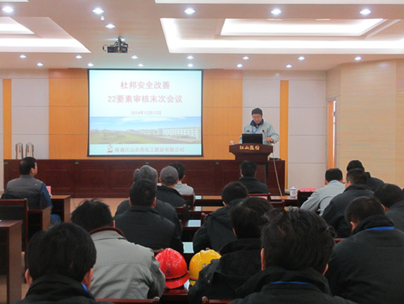 12月12日下午,杜邦安全改善項目年度審核末次會議在江山股份西區(qū)6號會議室召開。該公司總經(jīng)理薛健發(fā)表重要講話。 12月8日至11日,杜邦審核老師對我公司杜邦安全改善項目進行階段性審核。本次審核依據(jù)的是杜邦安全管理系統(tǒng)的行為安全(安全文化機制)和工藝安全(風險管理機制)22要素審核清單。審核老師主要通過訪談、查閱、觀察三種方法了解公司當前的HSE管理現(xiàn)狀,并進行審核評分。